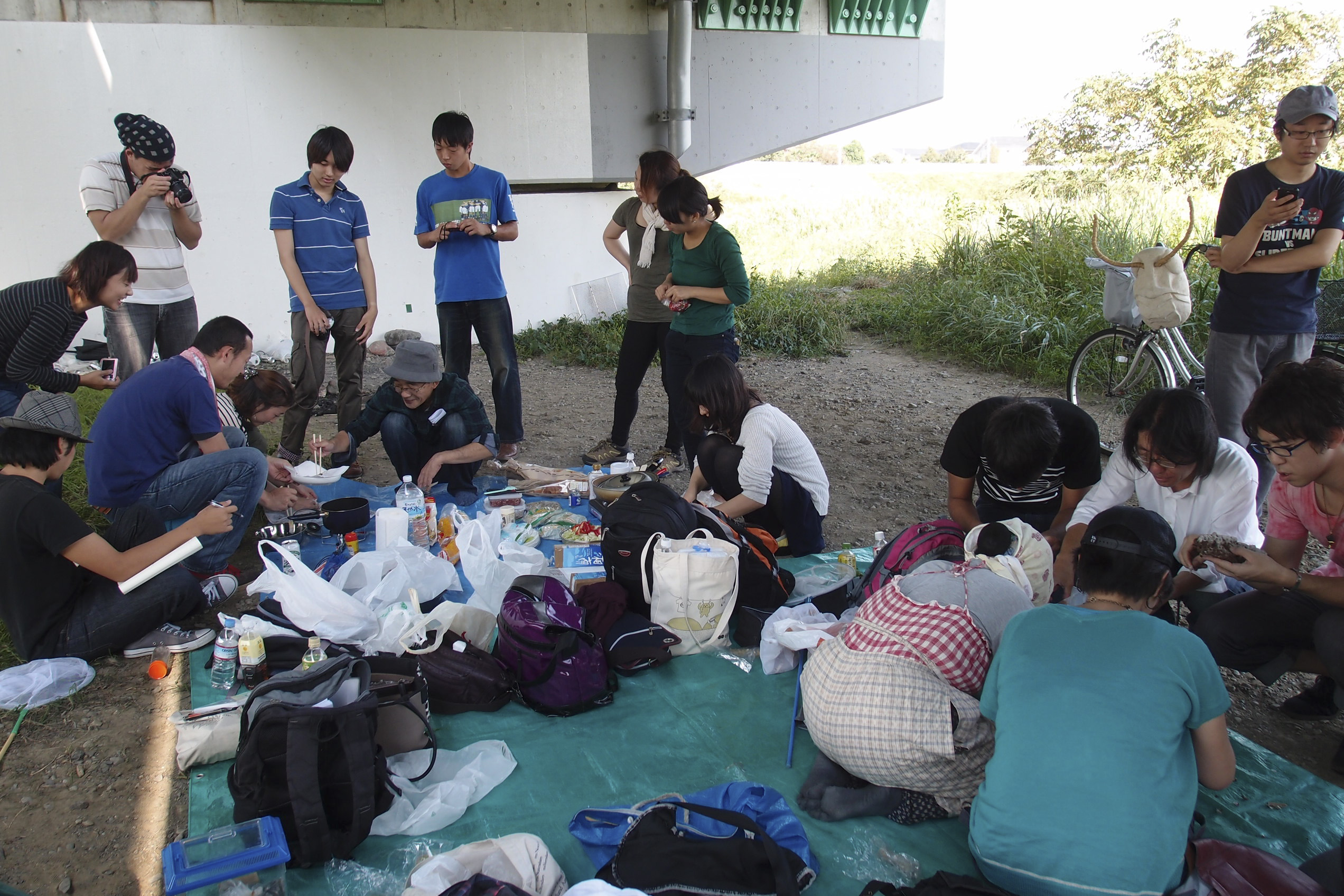 多摩川の河川敷でバッタを採り、その場で揚げて食べる野外イベント。