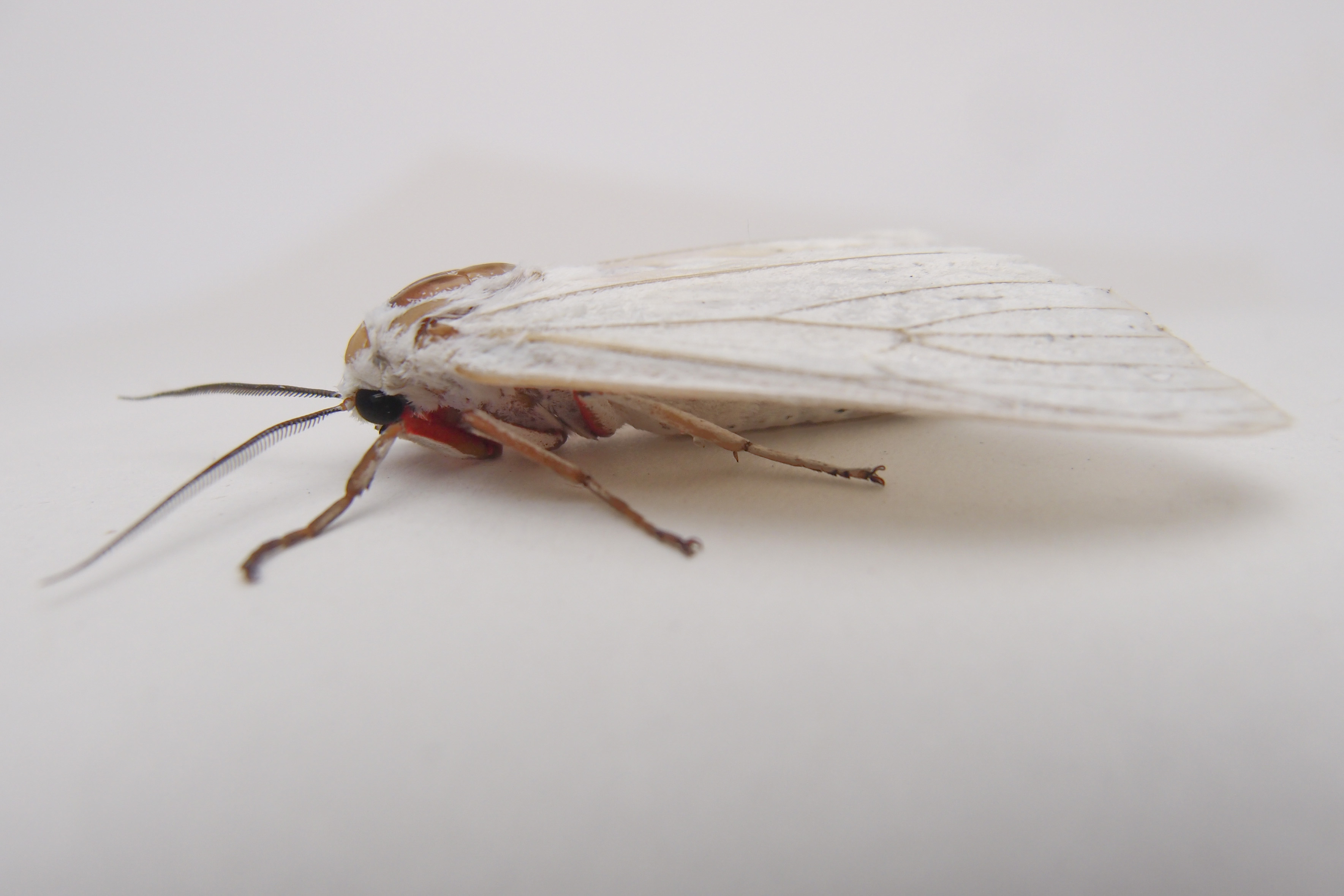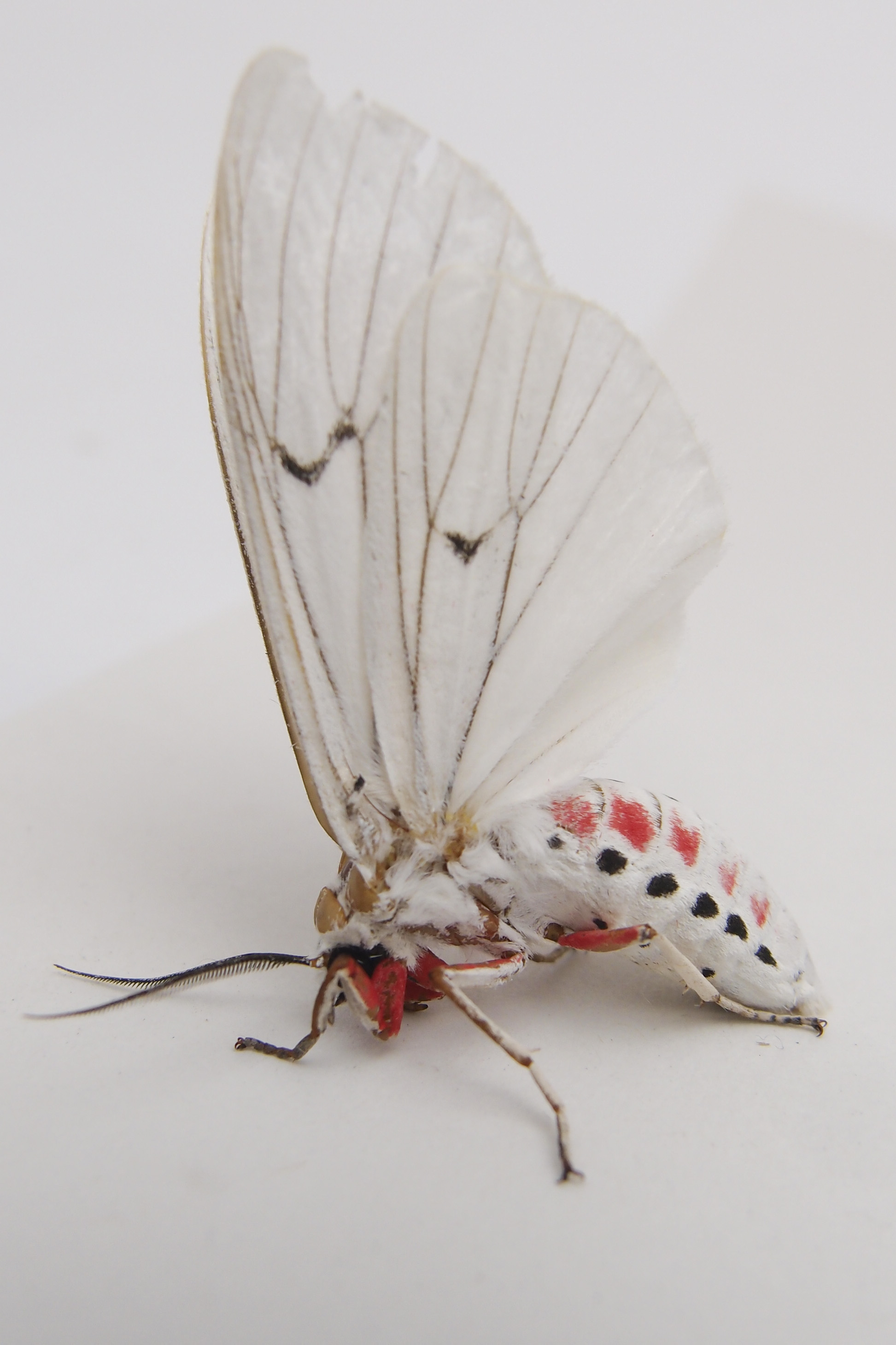 真っ白で赤のポイントがかわいらしい女性的な蛾ですね。