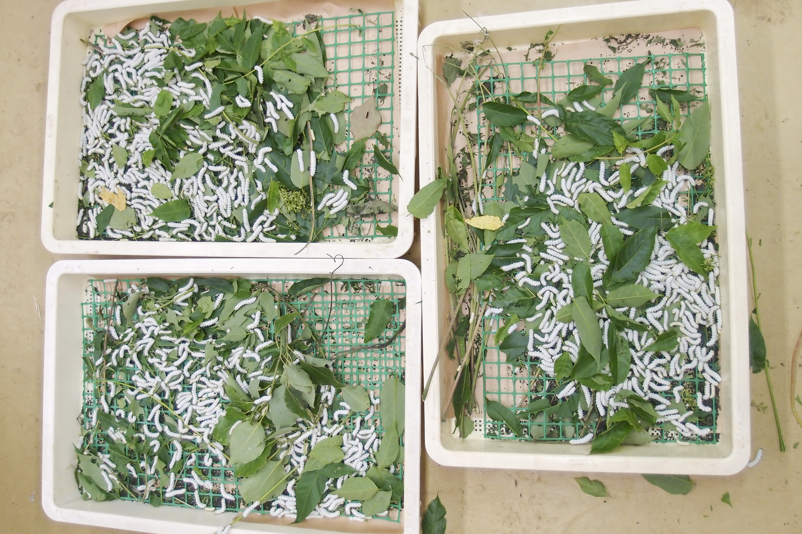 カイコより大型になり、終齢は大量に食べるので、近所に採集可能な木があることが必須です。