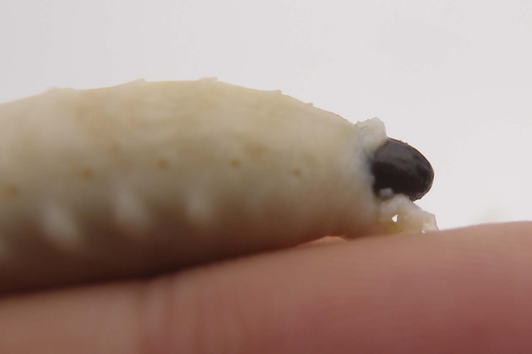 幼虫はいわゆる「背わた」が入っているので背中に黒い筋が見えます。