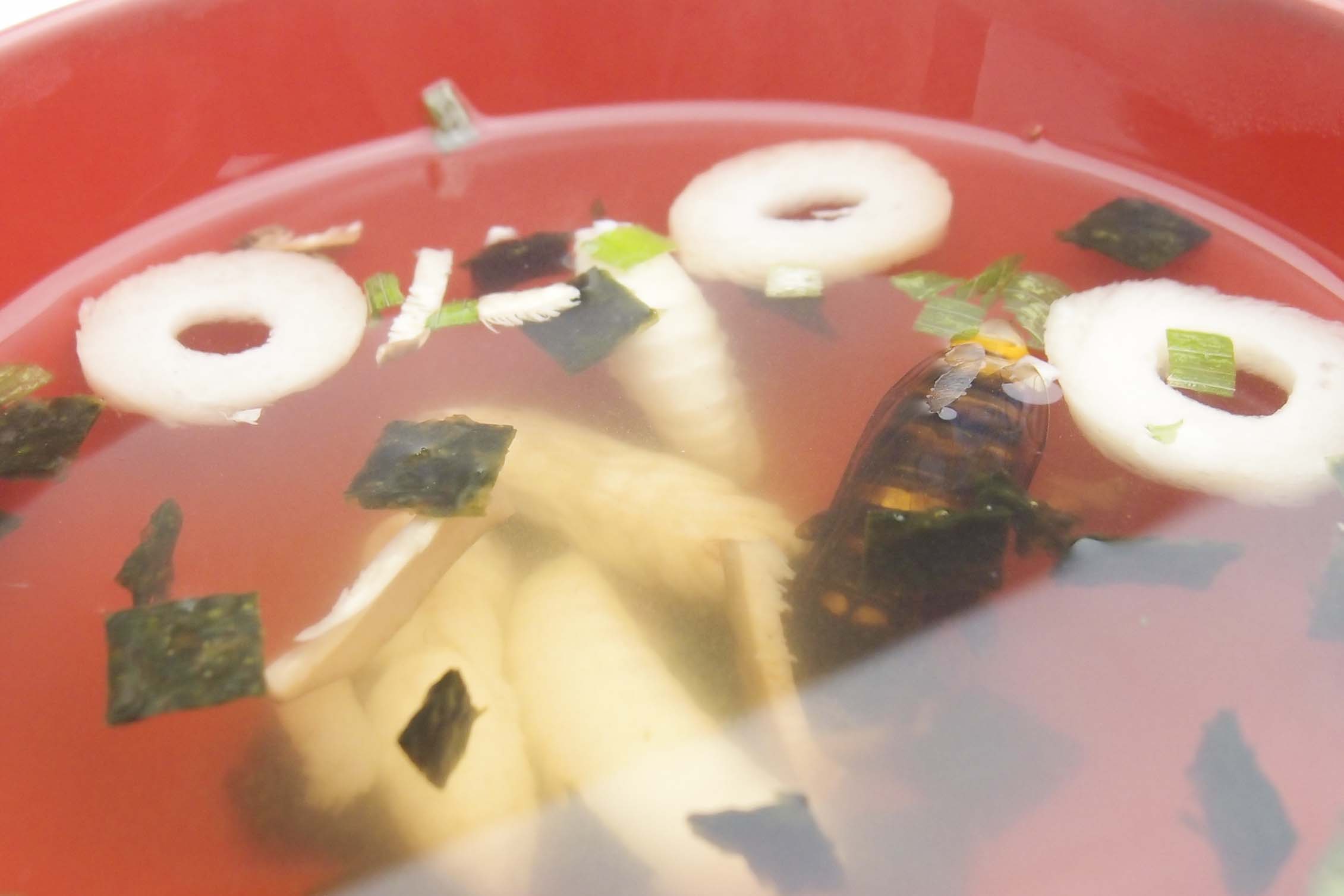 オオスズメバチ蛹のお吸い物がメニューにあり、