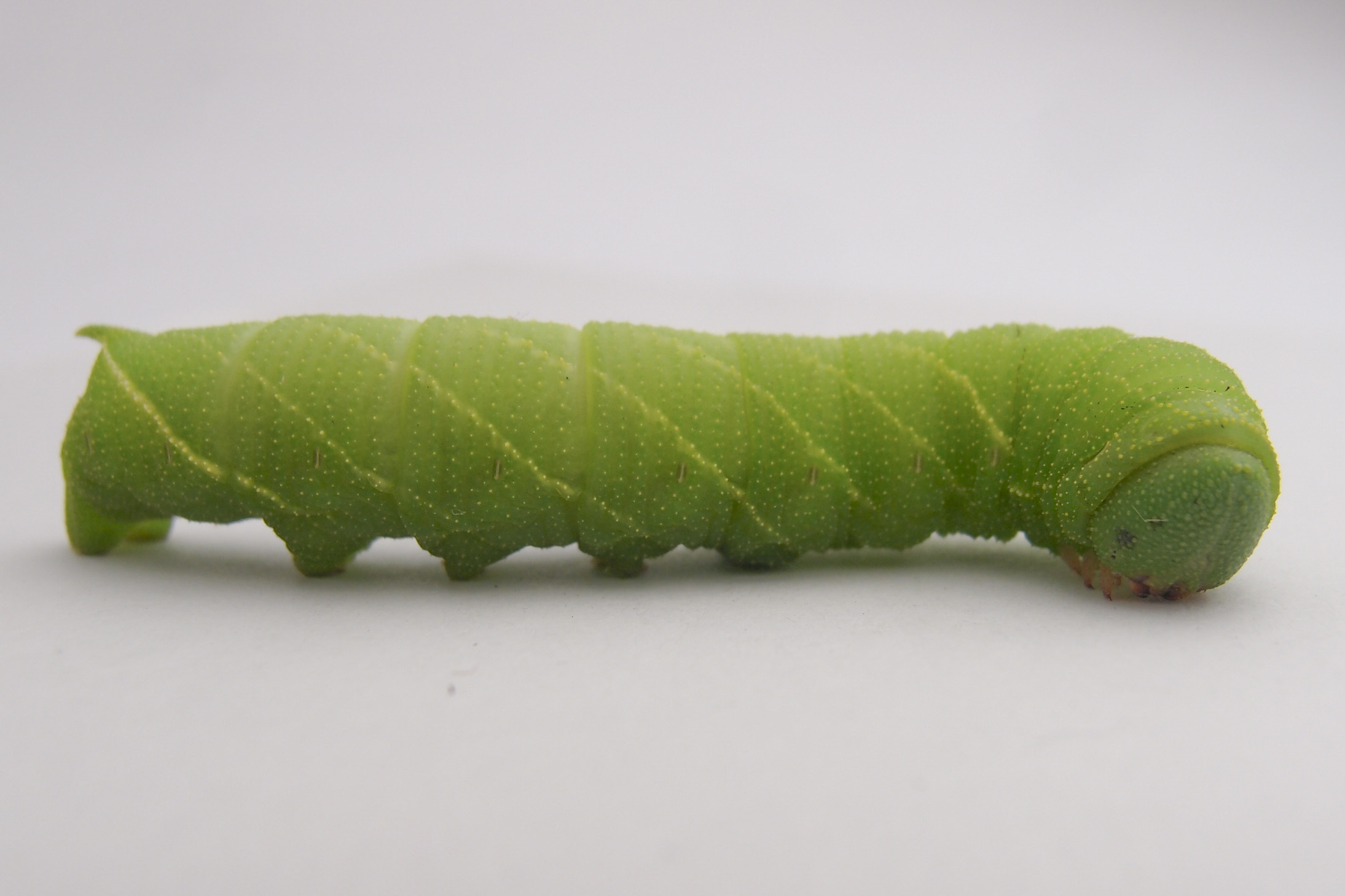 今玄関の前に2、3cmくらいの緑色のイモムシが転がっていました