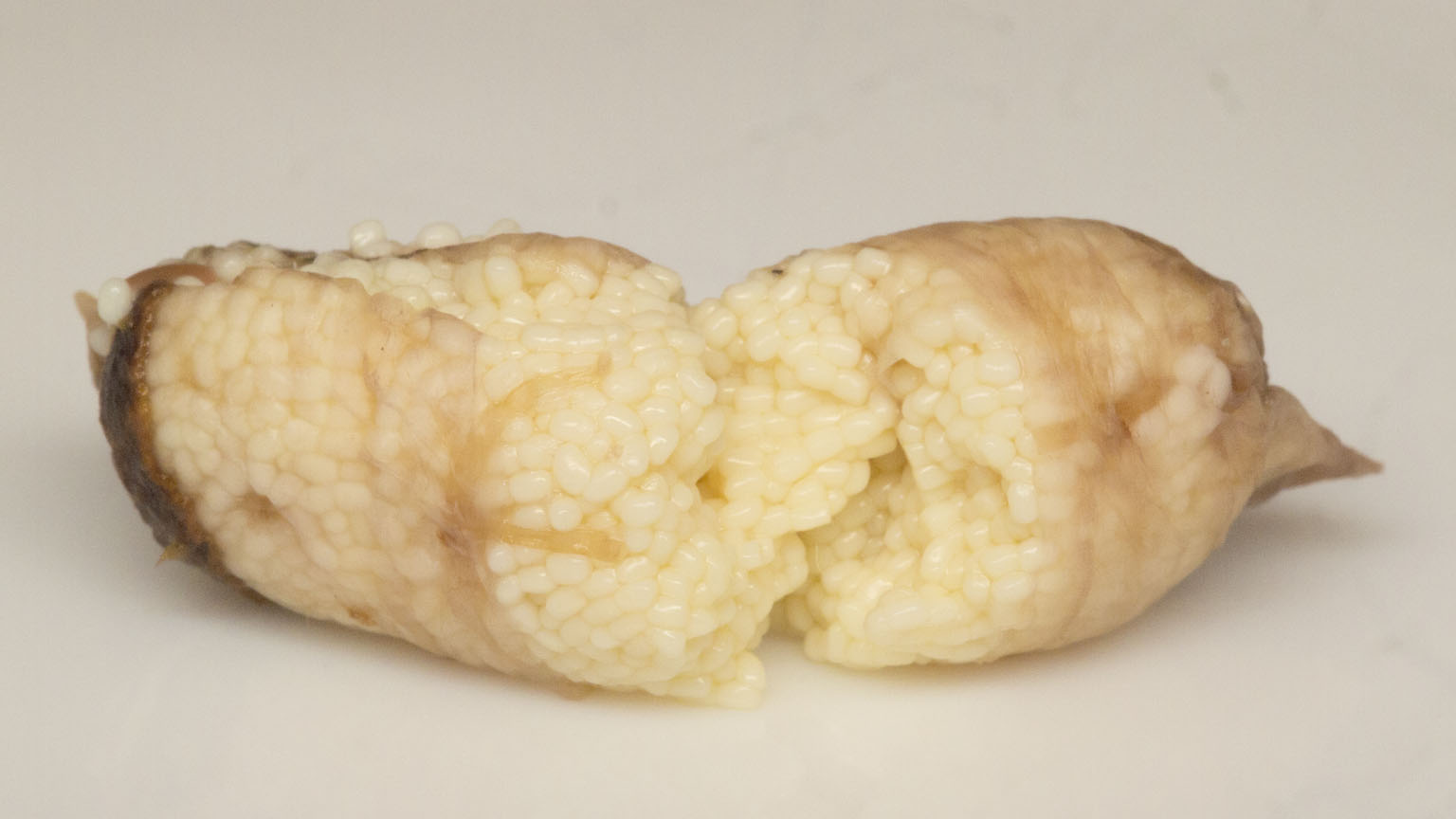 割ったところはバラす前の魚卵にそっくりですし、