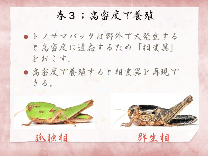 「相変異」という密度に応じた生理的変化が起こることが知られており、