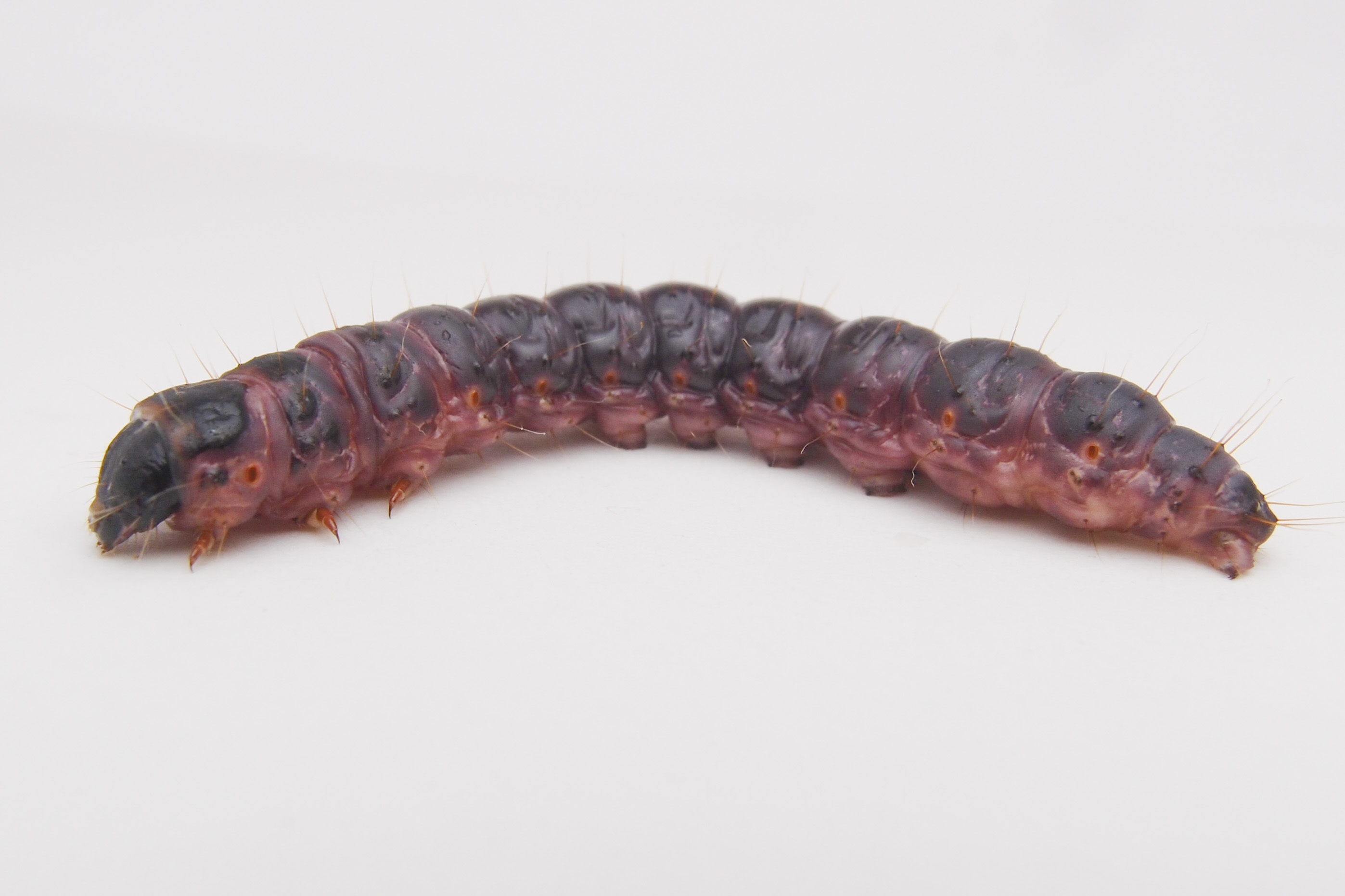 蛾の幼虫なのに頭部と胸部第一節、第二節ががクチクラで補強されていて
